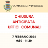 Descrizione In data 7 febbraio 2024 gli uffici comunali del Comune di Viverone chiuderanno anticipatamente alle ore 11:30. Ci scuciamo per il disagio.