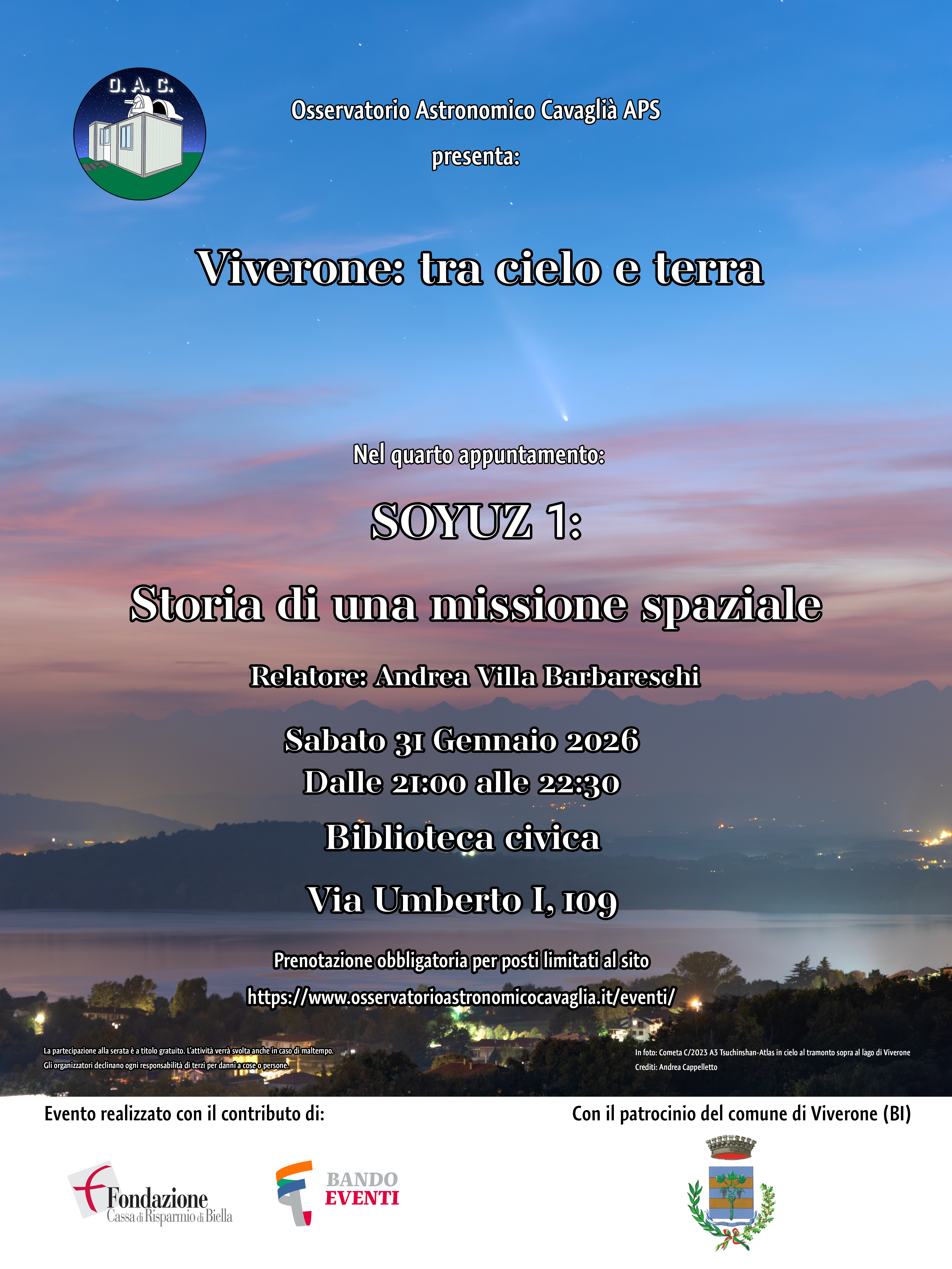 Evento gratuito con obbligo di prenotazione al seguente link: https://www.osservatorioastronomicocavaglia.it/.../soyuz-1/