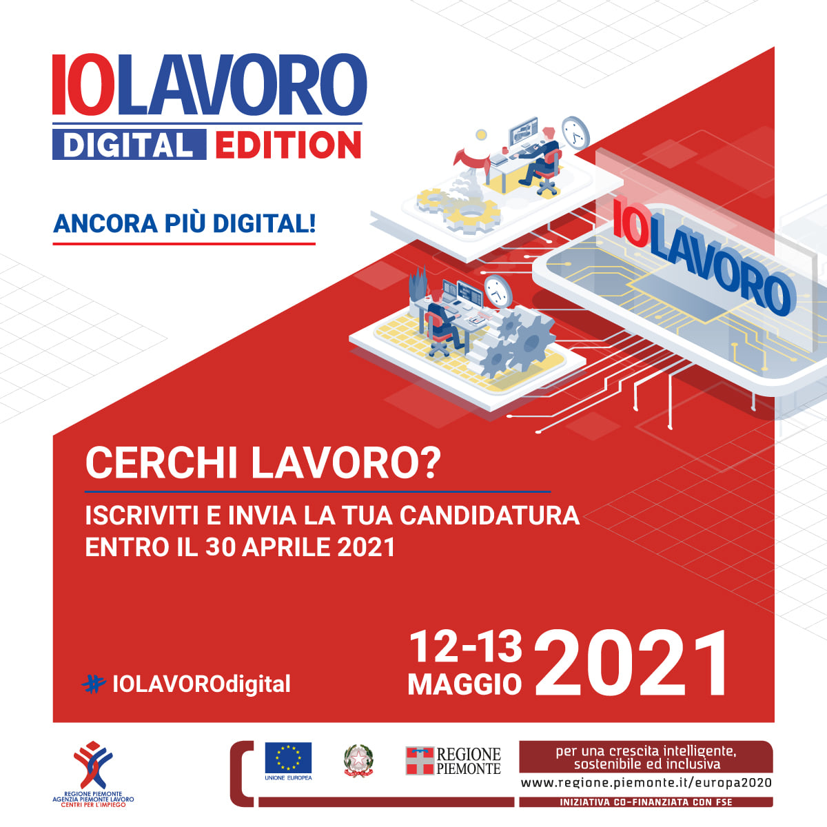 Dopo il successo del 2020, la seconda edizione digitale di IOLAVORO torna a offrire il più importante spazio virtuale dedicato all’incontro fra domanda e offerta di lavoro e all’orientamento professionale. L’evento, organizzato da Agenzia Piemonte Lavoro, sarà articolato in due giornate: mercoledì 12 e giovedì 13 maggio, dalle ore 10.00 alle 18.00, sulla piattaforma www.iolavoro.org.