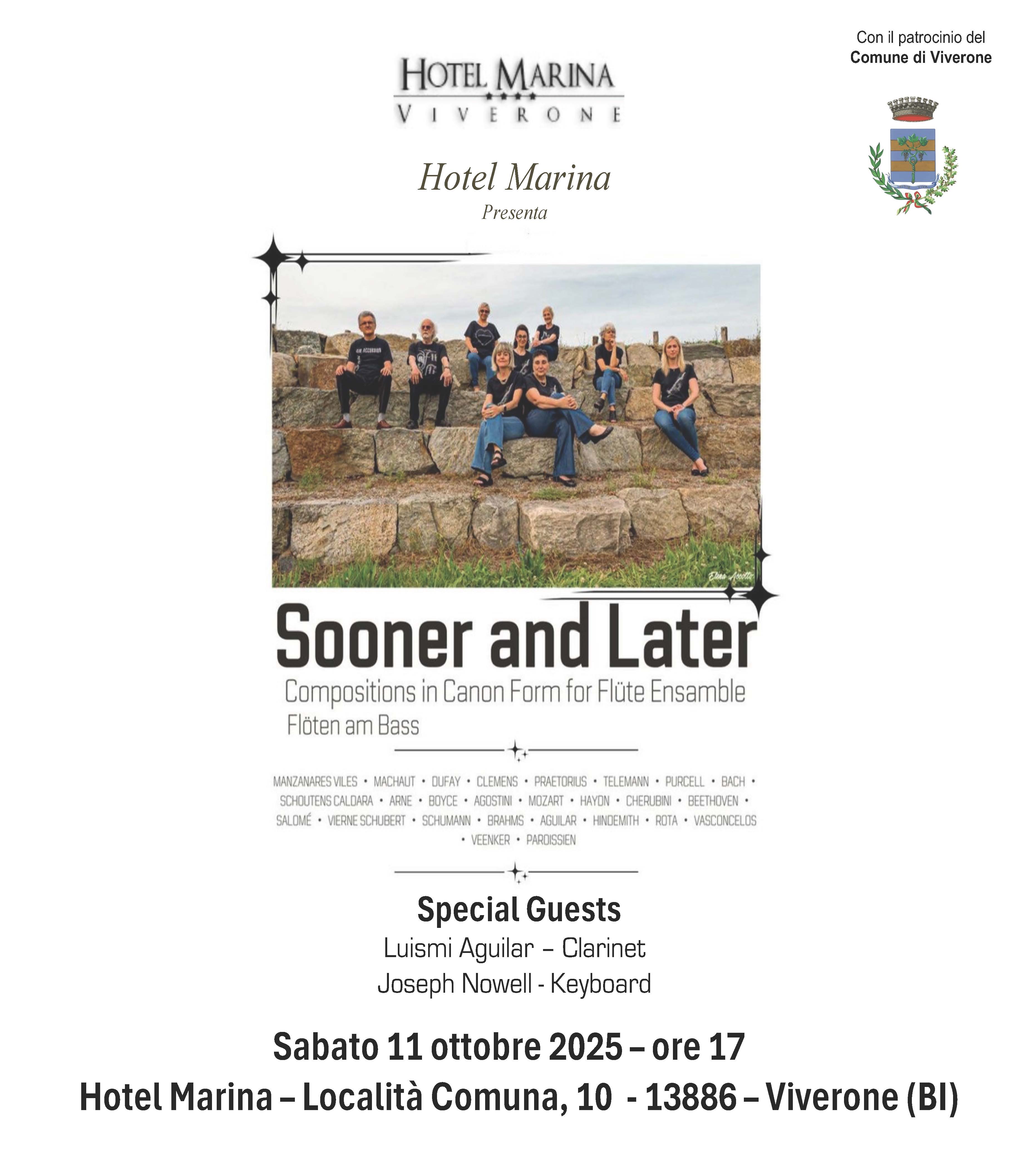 Sabato 11 ottobre 2025 alle ore 17, l’Hotel Marina di Viverone ospita lo straordinario concerto "Sooner and Later" – un’esperienza unica con composizioni in forma di canone per ensemble di flauti Special Guests